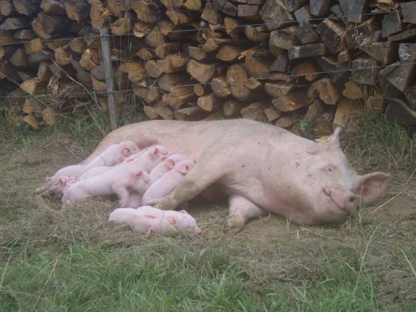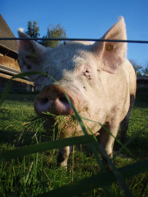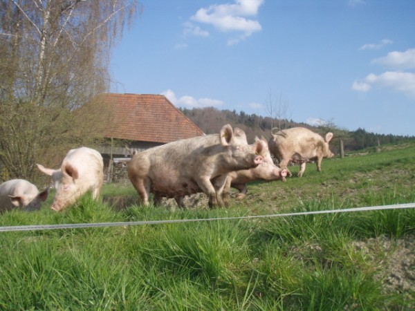 Die Galtsauen werden während der Trächtigkeit in einer Grossgruppe gehalten. Sie können immer den Auslauf benützen. Bei schönem Wetter und trockenem Boden geniessen unsere Tiere jeweils abends die Weide. Sie warten immer ganz gespannt auf das Öffnen der Weidetüre damit sie dann mit einem lauten "u u" die Erdrampe hinauf springen können.